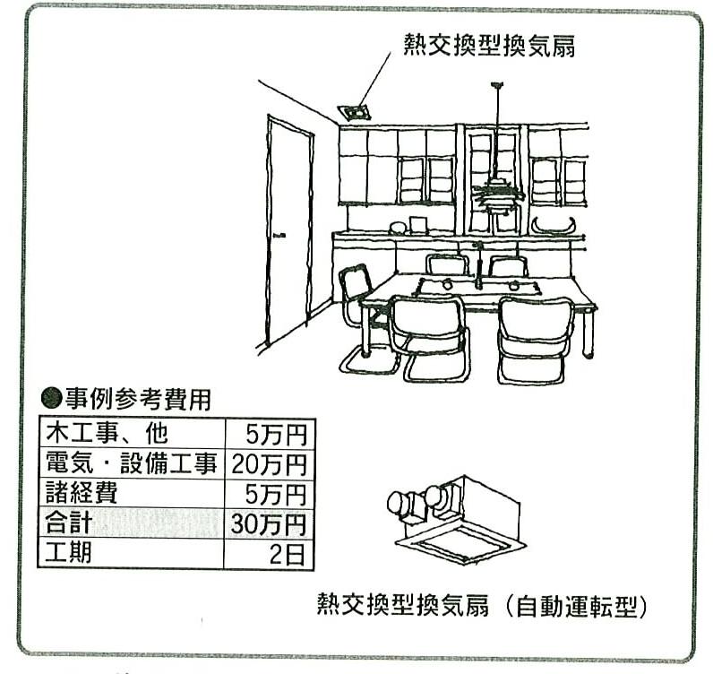 居間と寝室、子ども部屋に熱交換型の換気扇を入れた事例です。ご主人が煙草を吸うので居間には天井埋め込み型を設置し、寝室と子ども部屋は壁付け型にしました。居間には煙草の煙をセンサーで感知して、自動運転するタイプのものを取り付けています。これで煙草を吸う度にキッチンの換気扇の前に立っていかなくてもよくなりました。
