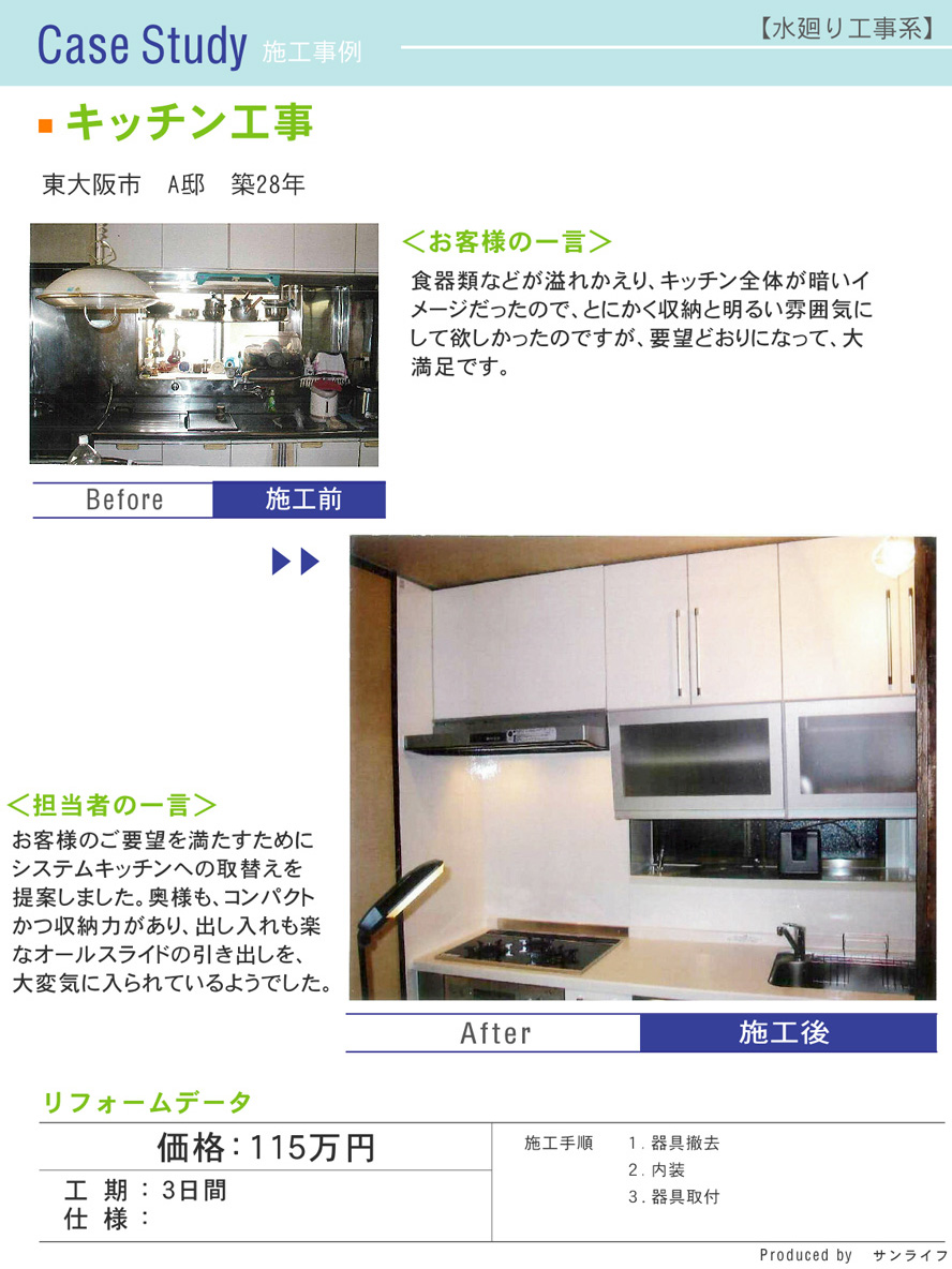 お客様のご要望を満たすために、システムキッチンへの取替えを提案しました。